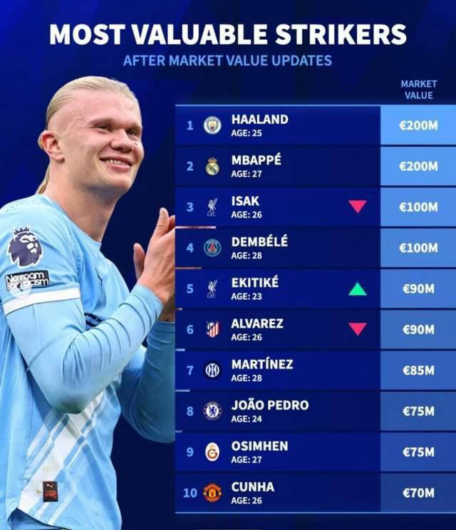 德国转会市场也更新了当今足坛中锋的身价情况,姆巴佩和哈兰德的身价均为2亿欧元,紧随其后的是伊萨克和登贝莱,各自的身价达到1亿欧。以下是当前足坛中锋身价前十名排行榜: